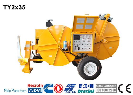 TY2x35 Hydraulic Tensioner The machine allows for the tension stringing of twin-bundle conductor of 630mm2 and below in mountainous and hilly areas, of twin-bundle conductor of 720mm2 and below in flat lands, and of conductor 720mm2 in various terrains; besides, it can be used for tension stringing of OPGW or ADSS optical cable and 500kV haulage rope in various terrains |